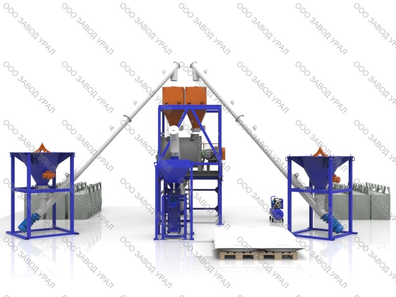В состав линии Мини завода для производства сухих строительных смесей входят: Смеситель, Станция фасовочная «МФШ-Урал», Шнековый транспортер, Рама. Также вам понадобятся электронные весы, товарные весы, компрессор, различные приспособления, инструменты и европоддоны. Потребление такого мини-завода около 38 кВт. Основными преимуществами «мини завода» являются: небольшие габариты размещаемые на ограниченных площадях, небольшая стоимость, высокая надежность, модульное исполнение инструментов(самостоятельный монтаж).