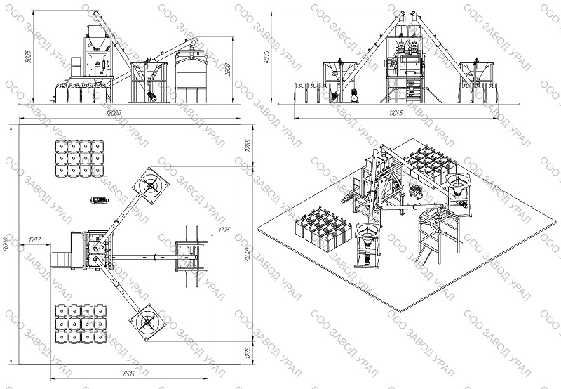 В состав линии Мини завода для производства сухих строительных смесей входят: Смеситель, Станция фасовочная «МФШ-Урал», Шнековый транспортер, Рама. Также вам понадобятся электронные весы, товарные весы,компрессор, различные приспособления, инструменты и европоддоны.Потребление такого мини-завода около 34 кВт. Основными преимуществами «мини завода» являются: небольшие габариты размещаемые на ограниченных площадях, небольшая стоимость, высокая надежность, модульное исполнение инструментов(самостоятельный монтаж).